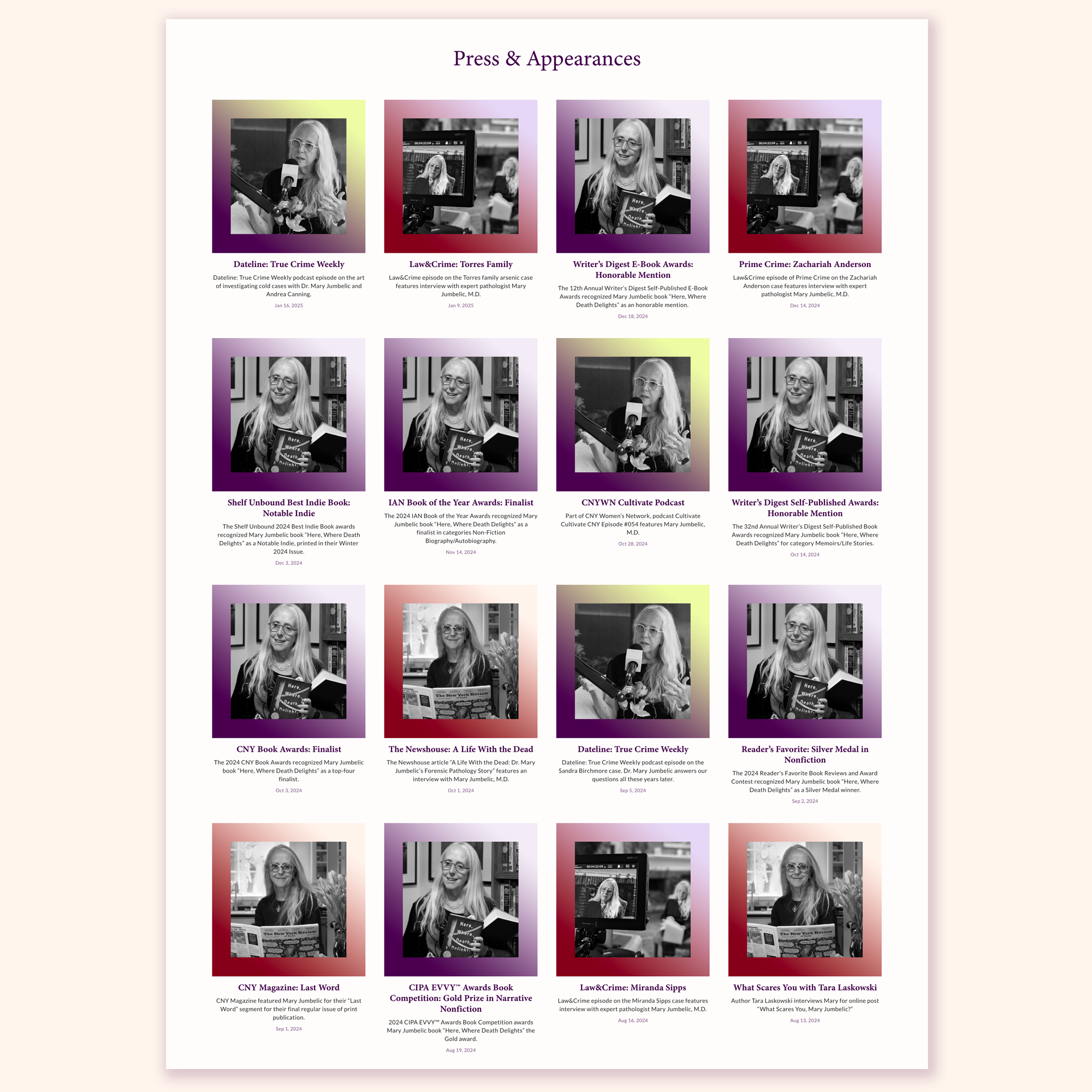 Additionally, we wanted to elevate the presentation of her work to match the level of expertise she has demonstrated time and again around the world. Not only did we display the classic ‘logo carousels’ showcasing the prominent media outlets where she is featured, but her new ‘Press’ pages allow the viewer to watch, listen and read this media, immersing themselves in Mary’s world to share in her wisdom of experience.