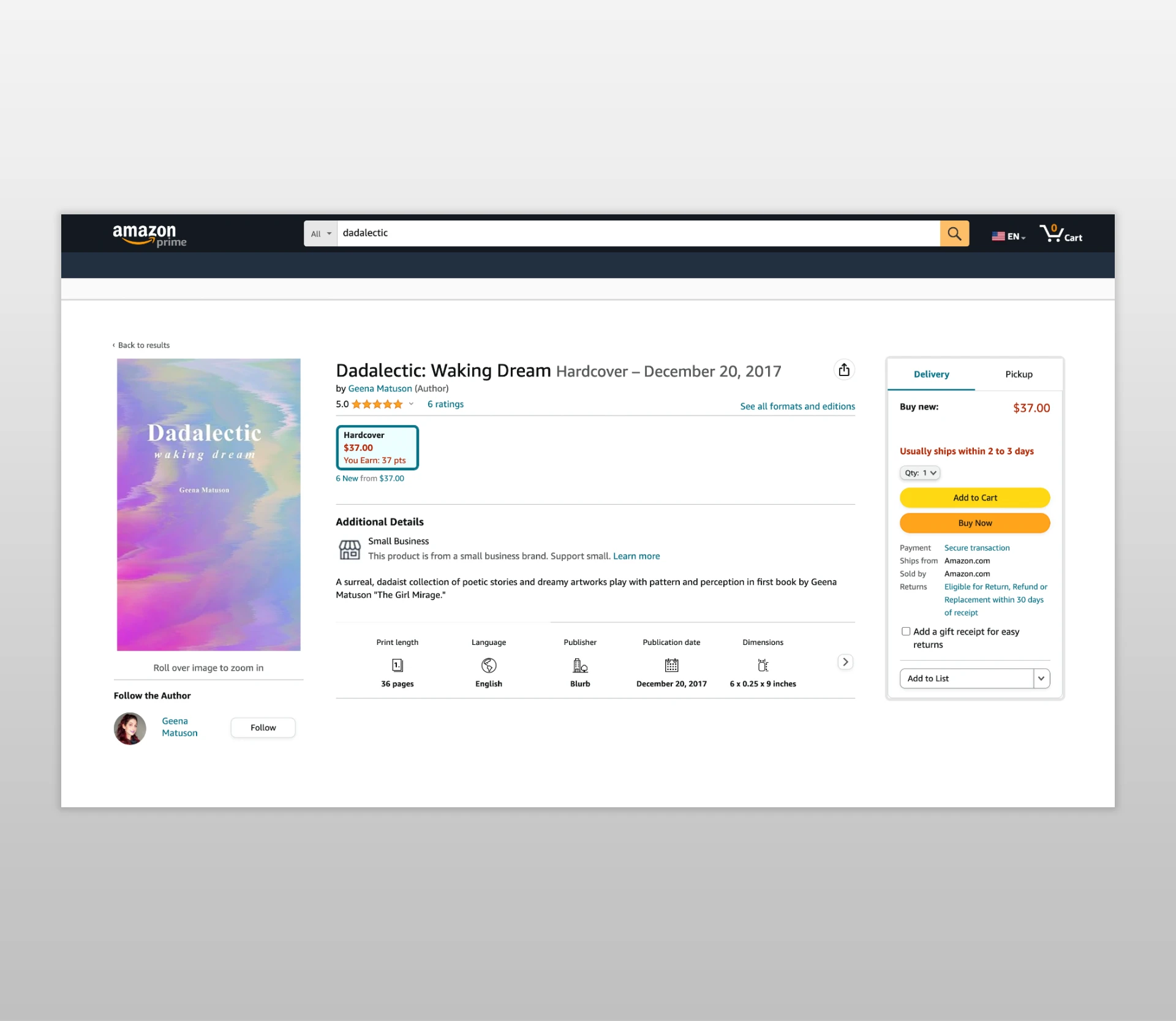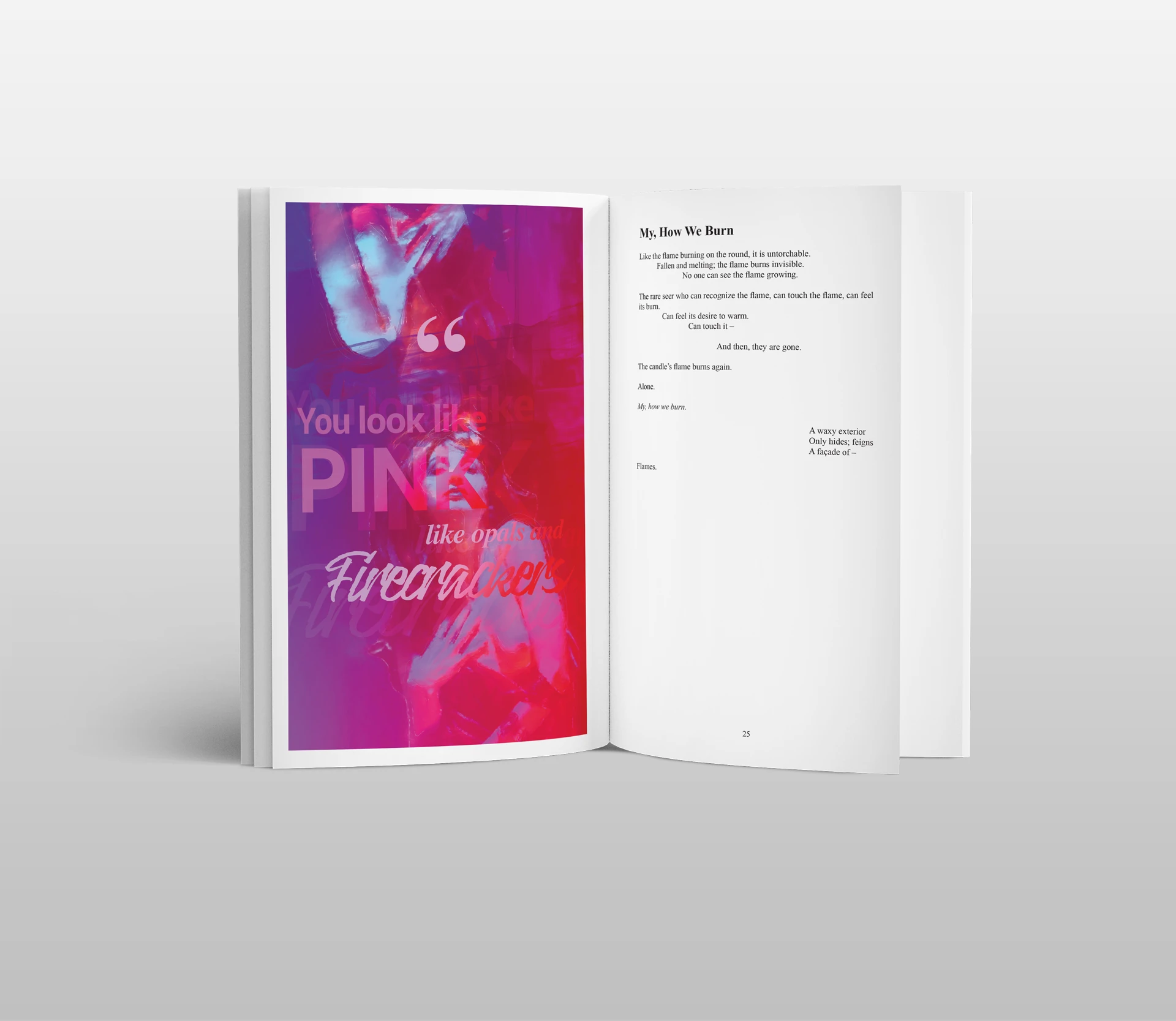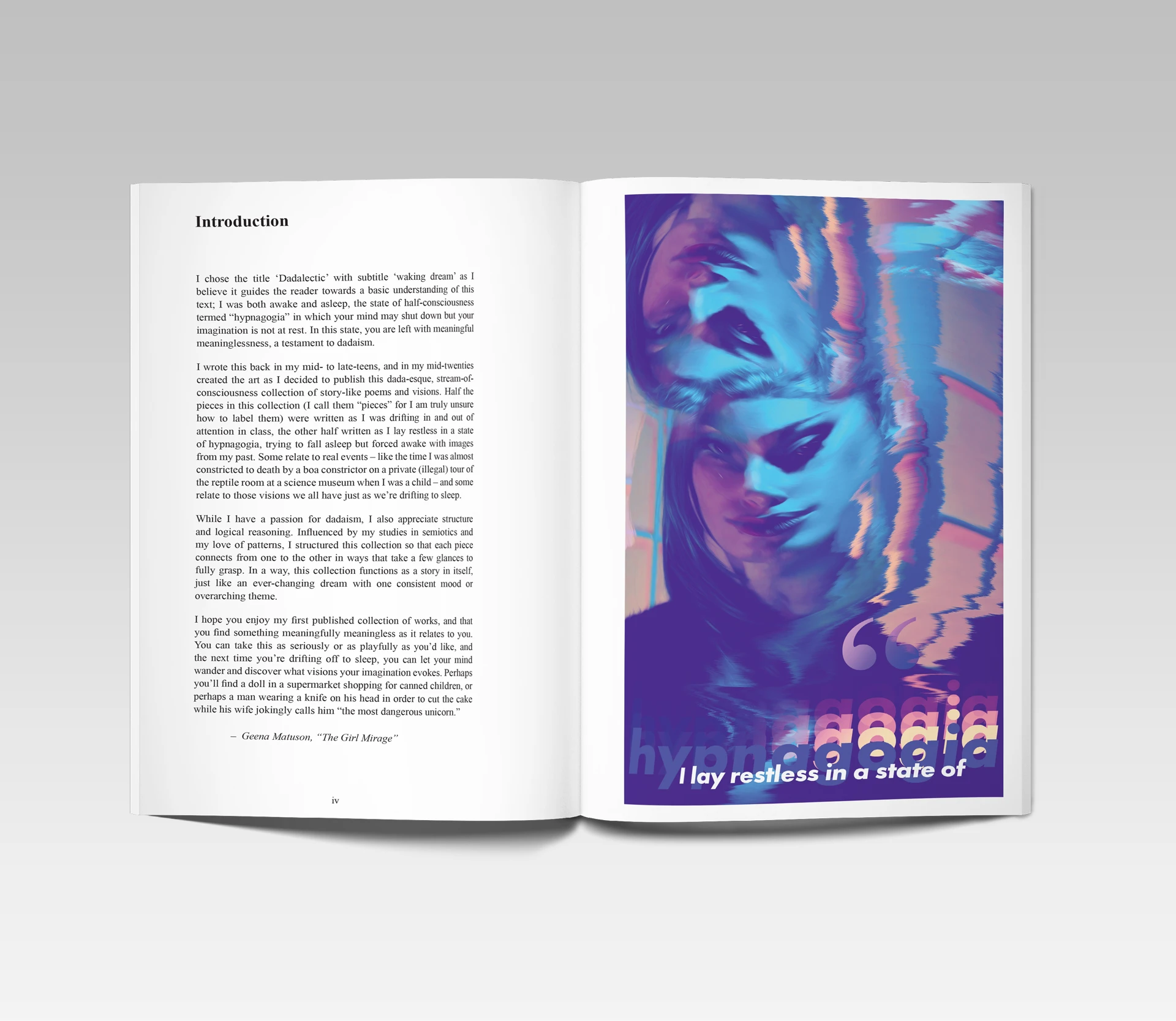 Book editorial design, printing and publishing were needed to turn this content into a cohesive product and bring it to market. The 18 works formed a collection of Geena's original poetry for which 9 digital artworks were formatted to highlight the poetry's structural significance. The content was then strategically positioned to tell an overarching story; while each poem tells its own tale, each work transitions into the next to tell a holistic narrative, forming the book Dadalectic: Waking Dream.