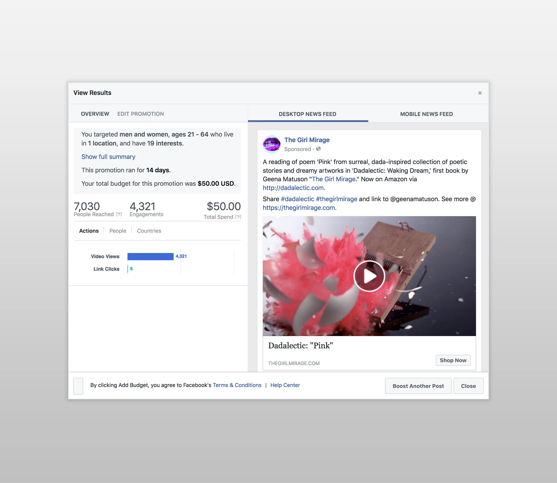 The 36-page, full-color book titled Dadalectic: Waking Dream was completed, printed, published and distributed through GRN — and in less than 1 month, multiple sales and 5-star reviews were received on the book's Amazon product page. In just 2 weeks with a $50 spend, the Facebook video awareness campaign reached 7,030 people with 61% engagement. Additional press outreach led to a book reading and signing at local library, with the book placed on shelves at multiple libraries.