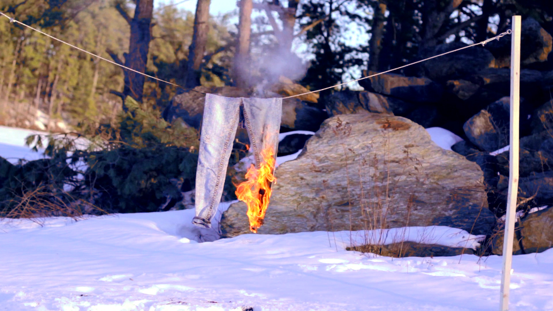 Overview: This piece involves a pair of jeans burning on a clothesline. The transformation of pants due to the fire, and transformation of fire as it destroys the pants, shows the ephemeral nature of things; no pair of pants will ever burn the same way.