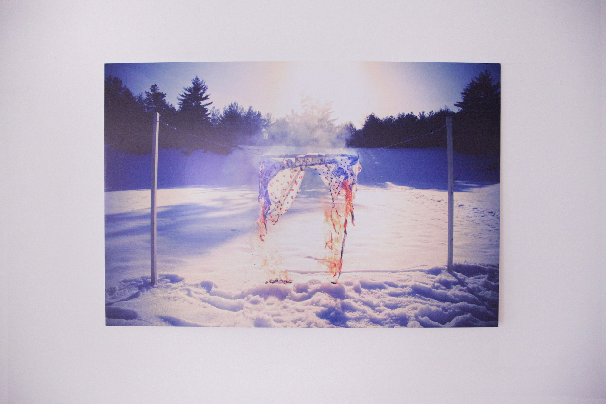 Overview: This 6-panel, large-scale print installation involves a curtain with a quaint print burning on a clothesline. The transformation of curtains due to the fire, and transformation of fire as it destroys the curtains, shows the ephemeral nature of things; no pair of pants will ever burn the same way. Based on the direction in which the viewer interacts with the series in the gallery space, the progressive transformation of curtains is ravaged—or rebuilt—by fire.