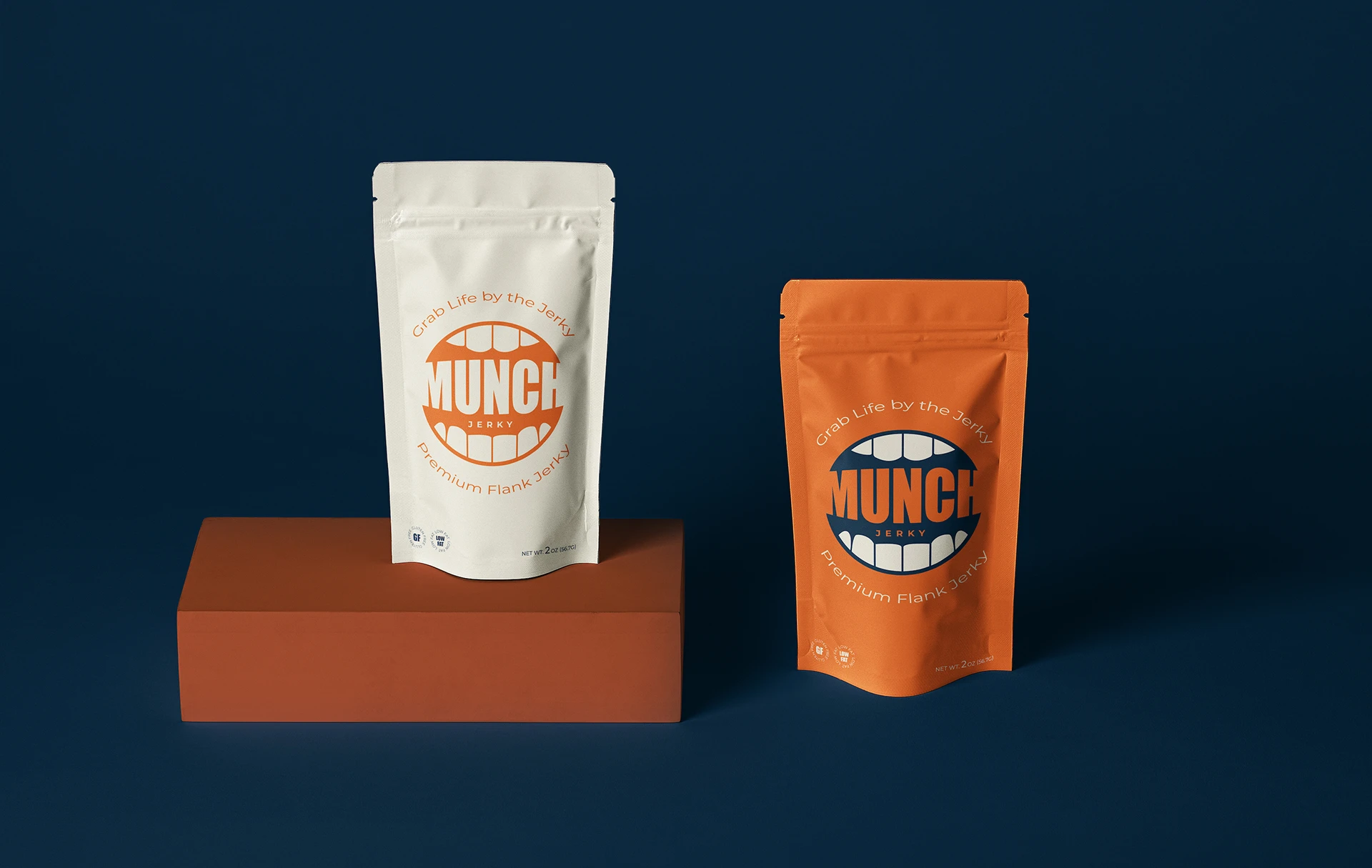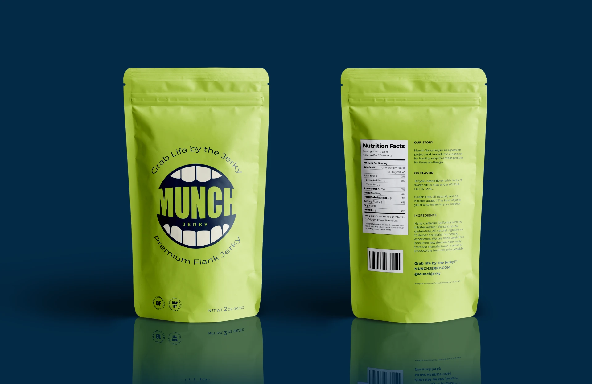 Upon project completion, the branding and packaging mockups were provided to manufacturers, and used for the first batch of the newly branded MUNCH Jerky. Post-pandemic, the product launched online, and has successfully sold-out several batches.