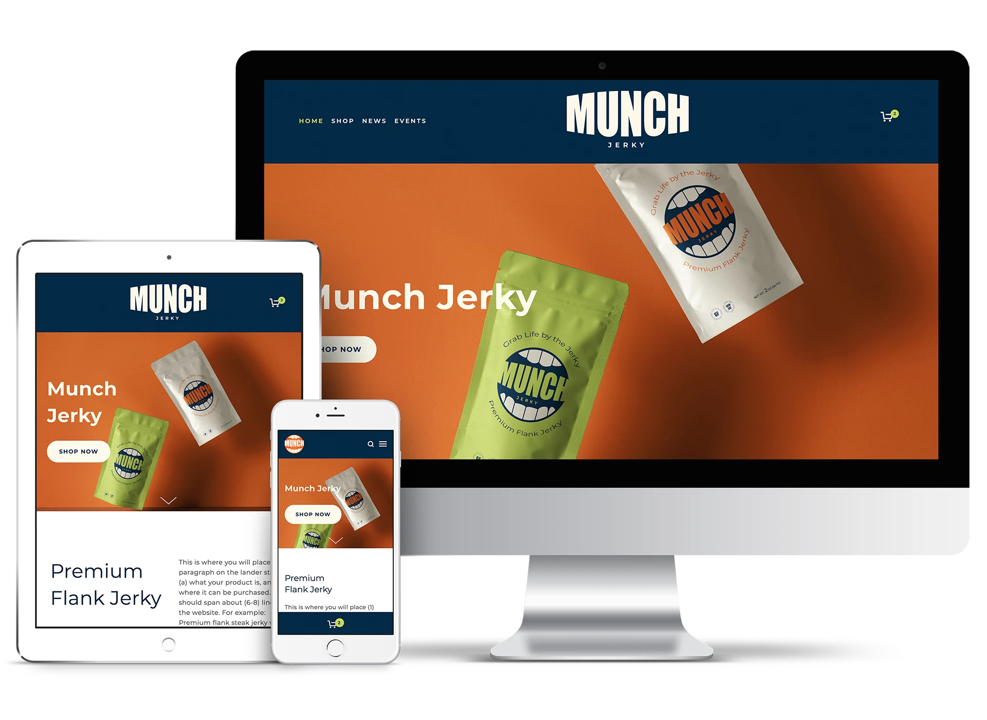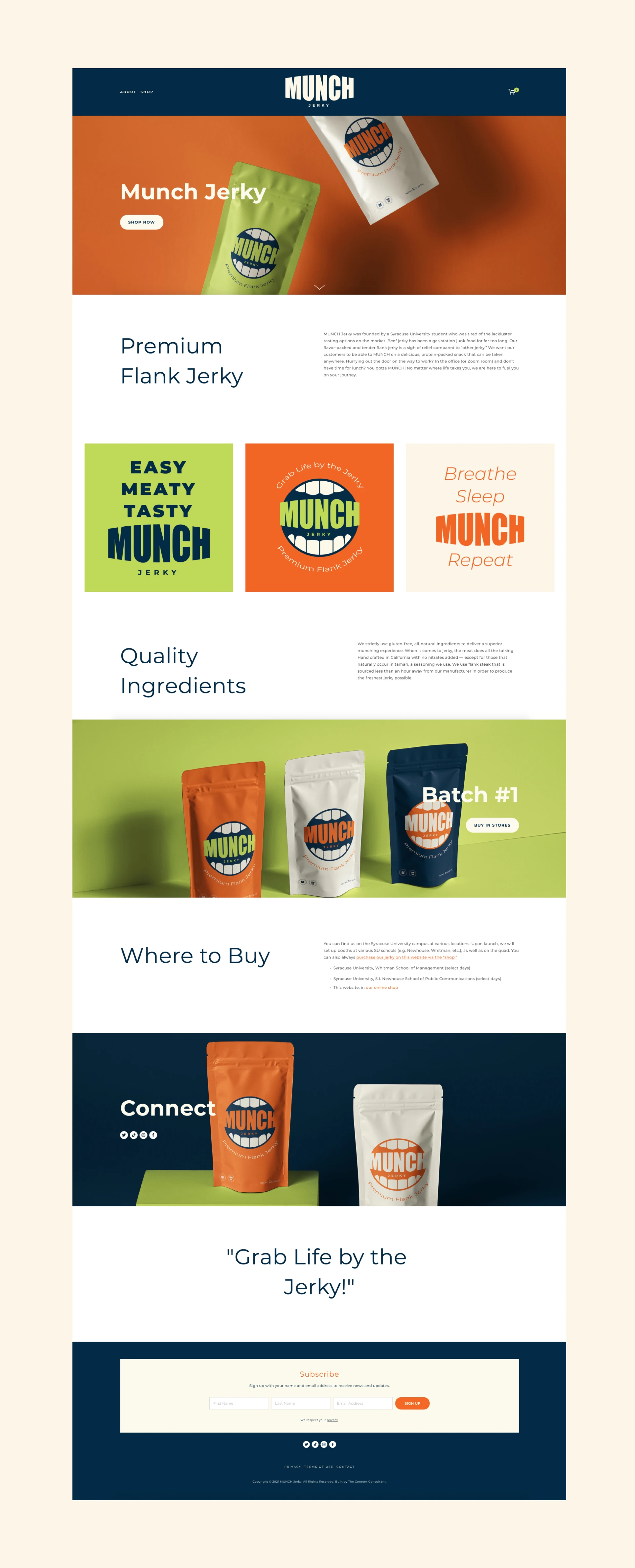 Initially selling jerky on Central New York college campuses by word of mouth ("WoM"), MUNCH Jerky wanted to reach a larger audience by expanding into the digital space with an online shop. However, the brand still lacked a solidified identity, target audience, and packaging.