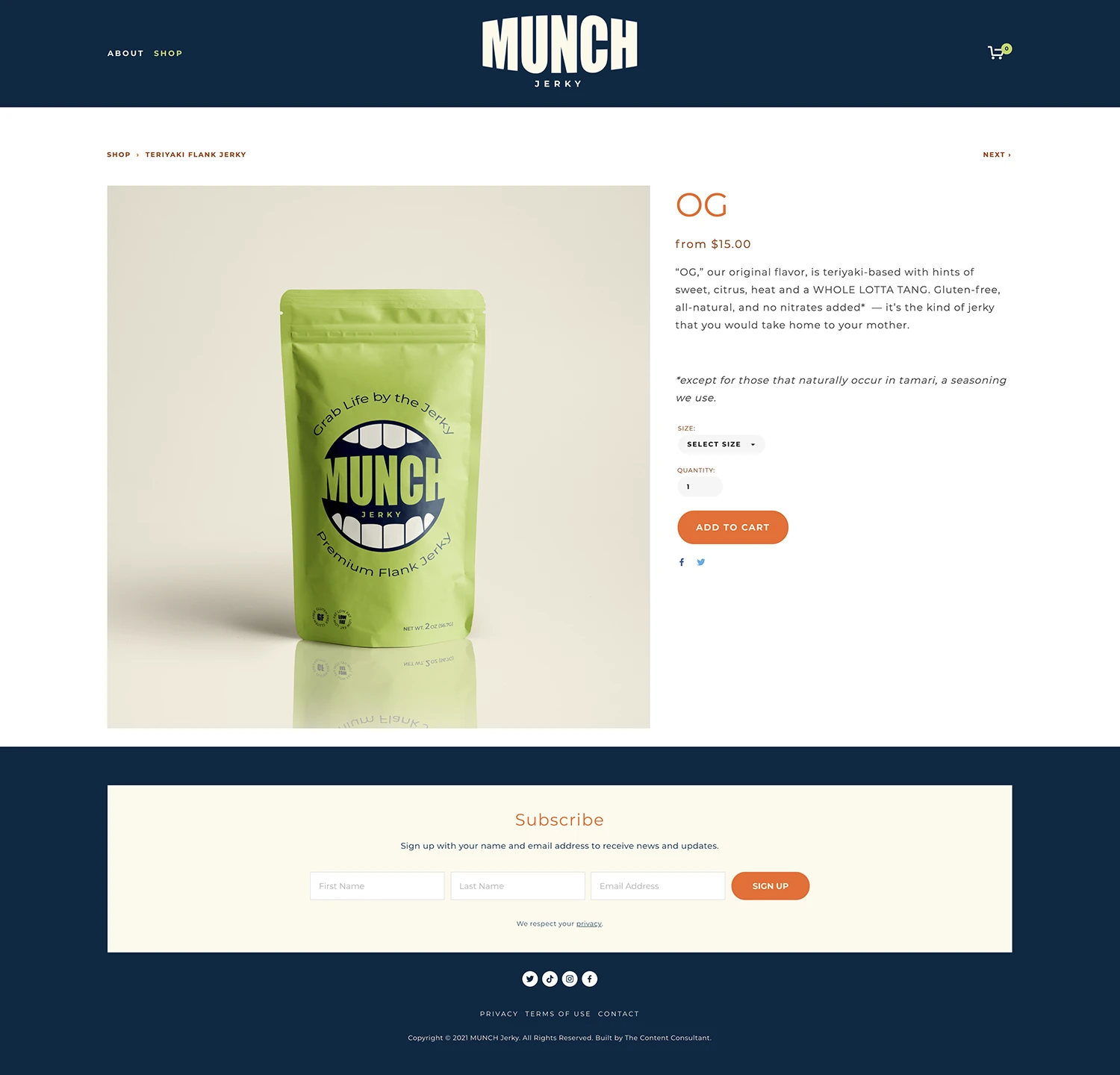 In order to build a recognizable online shop and sell this healthy jerky snack to the ideal customer, MUNCH Jerky first needed to solidify its target audience and develop its brand identity. Working with the founder to solidify the best fit campus audience, changes in professional athletics rules became the deciding factor: college athletes could now accept sponsorships, creating opportunity for this jerky to be the go-to collegiate athlete snack, leveraging its WoM and garnering user-generated content that could lead to larger sponsorships and affiliate marketing.