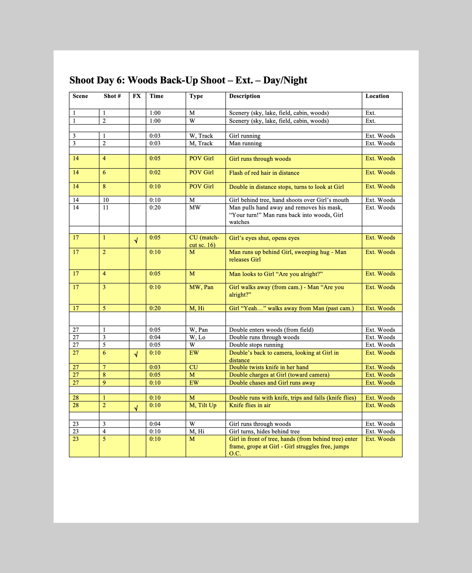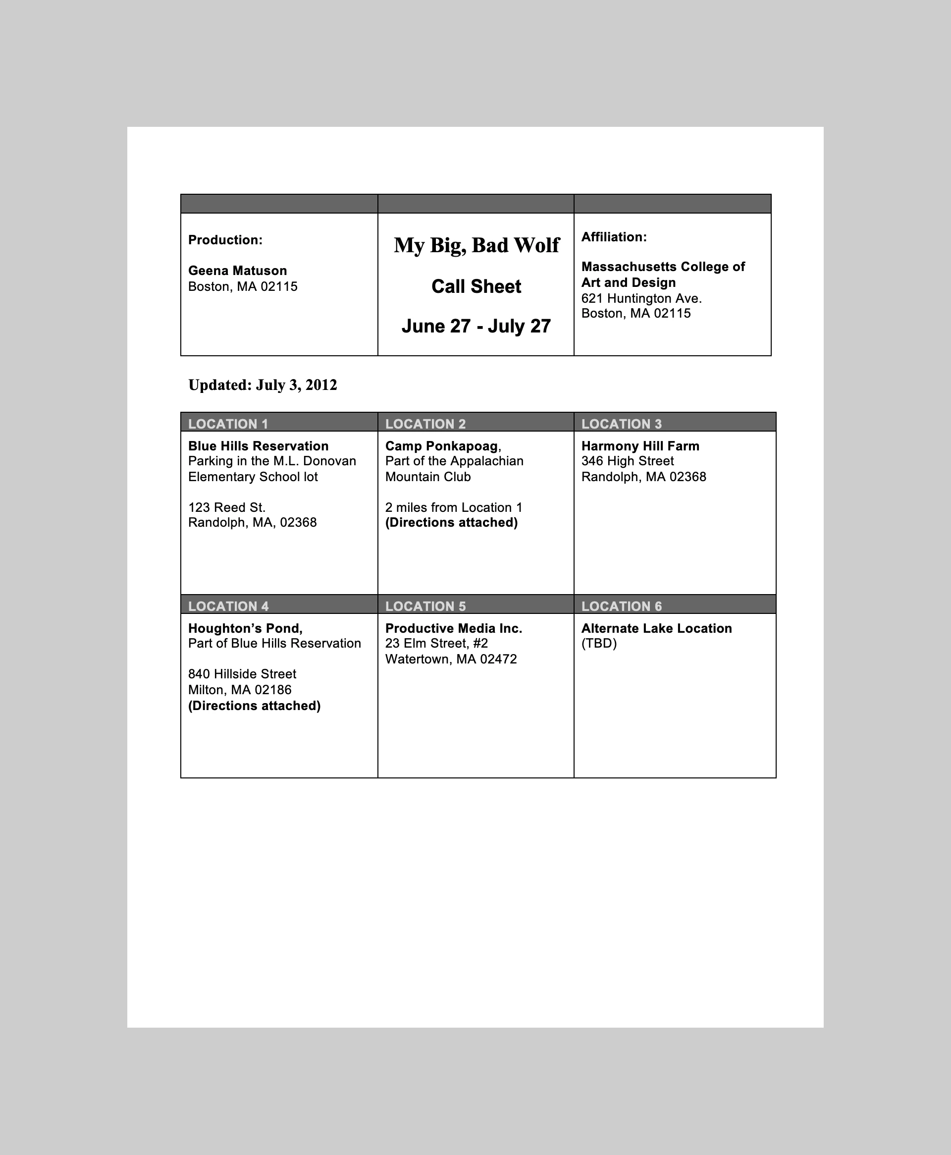 Original script with animatic and shot lists were created prior to scheduling. Casting was held, locations scouted, equipment secured, and call sheets were completed for filming.
