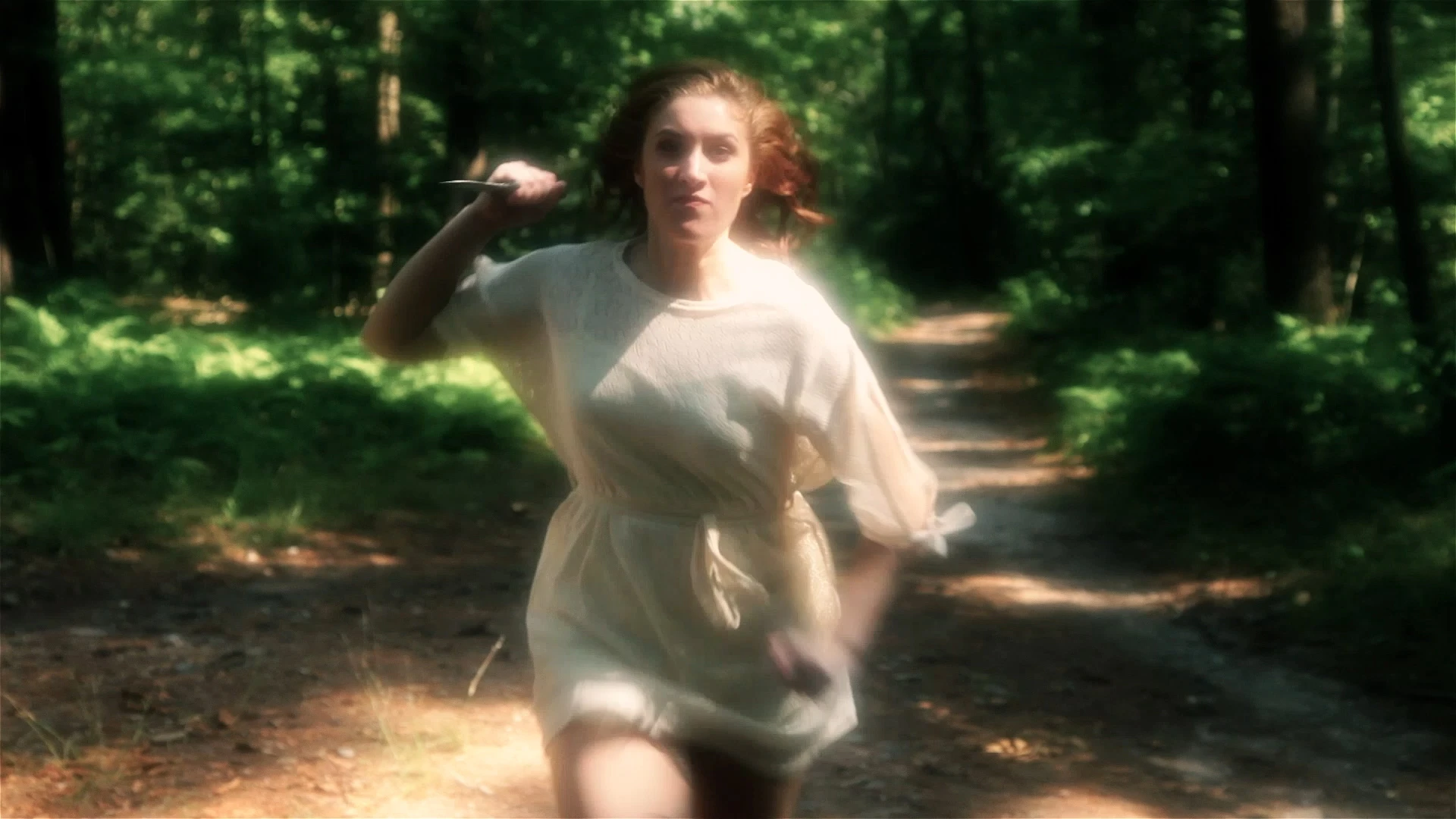 Pro-Mist filters were used on the video camera to create a balance with its filmic counterpart, giving the footage a “dreamy” glow. This “glow” also aided in nighttime filming, as it diffused light from the few battery-operated light sources rigged on tracks throughout the dark woods.